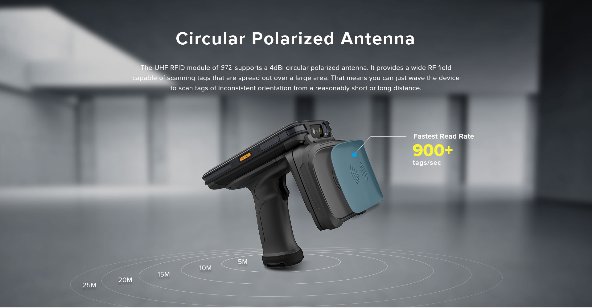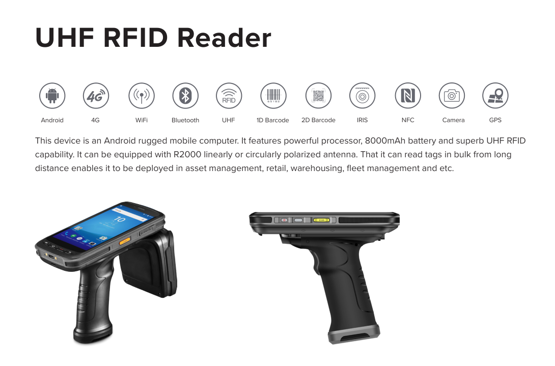 Capacité. Il peut être équipé d'une antenne R2000 à polarisation linéaire ou circulaire. Il peut lire des étiquettes en vrac sur de longues distances.